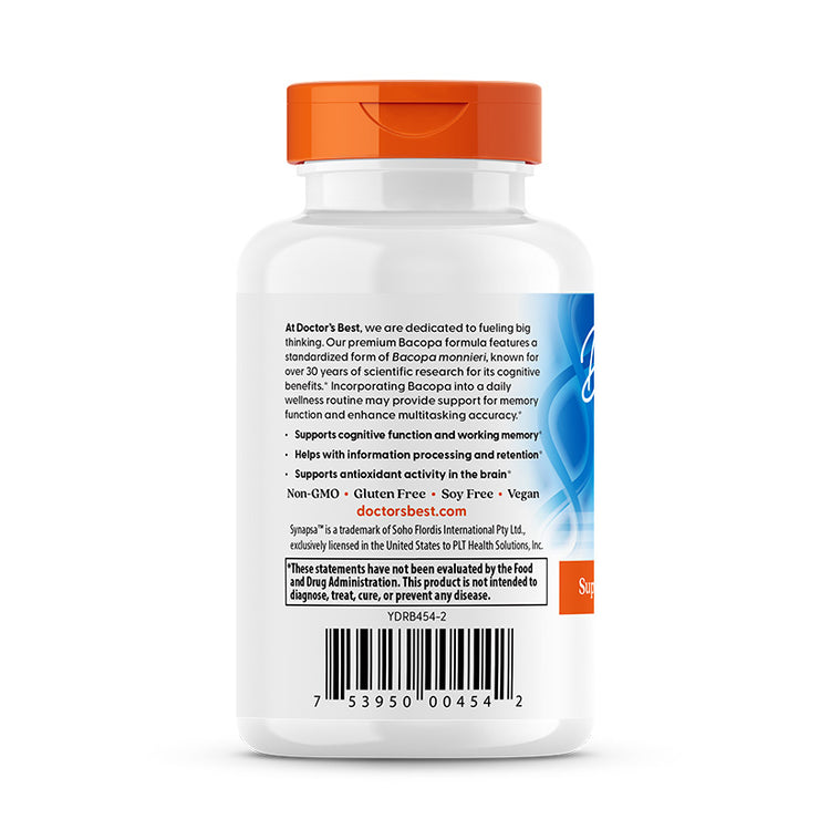 Odkrijte Doctor’s Best Bacopa with Synapsa, naravno prehransko dopolnilo izdelano v ZDA. Vsaka kapsula vsebuje 320 mg skrbno izbrane sestavine,zasnovane za enostavno vključitev v vašo dnevno rutino.