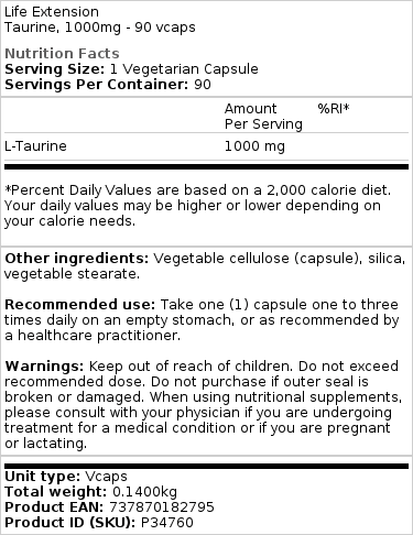 Life Extension – Taurin, 1000 mg – 90 vcaps