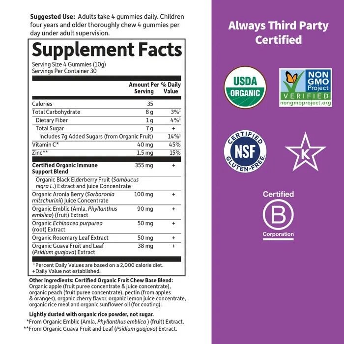 Izdelek vsebuje skrbno izbrane sestavine kot so bezgove jagode in druge naravne sadne komponente. Vsaka sestavina je izbrana zaradi svoje visoke čistosti in naravnega izvora.