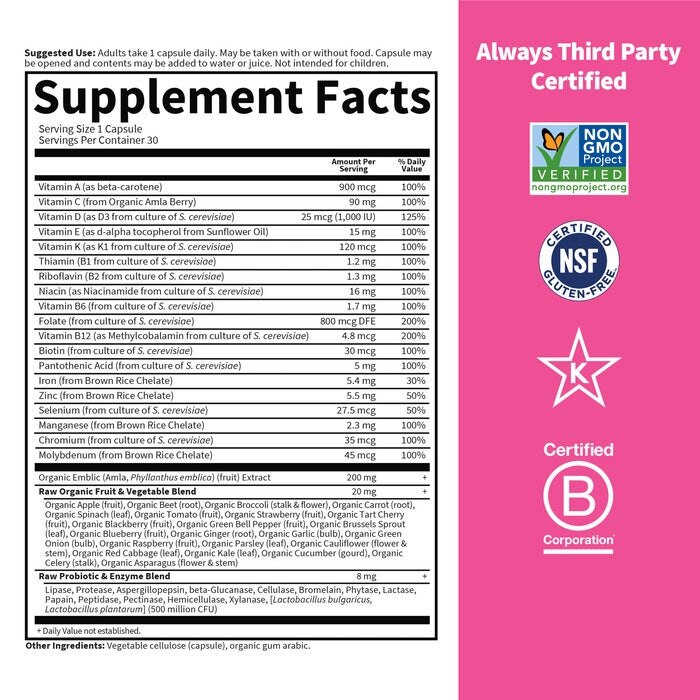 Ingredients: Vitamin A (as beta-carotene), Vitamin C (from amla berries), Vitamin D (as D3 from the culture of S. cerevisiae), Vitamin E (as d-alpha-tocopherol from sunflower oil), Vitamin K (as K1 from the culture of S. cerevisiae), Thiamine (B1 from the culture of S. cerevisiae), Riboflavin (B2 from the culture of S. cerevisiae), Niacin (as niacinamide from the culture of S. cerevisiae), Vitamin B6 (from the culture of S. cerevisiae), Folate (from the culture of S. cerevisiae) DFE, Vitamin B12 (from the culture of S. cerevisiae), Biotin (from the culture of S. cerevisiae), Pantothenic acid (from the culture of S. cerevisiae), Iron (from Brown Rice Chelate), Zinc (from Brown Rice Chelate), Selenium (from the culture of S. cerevisiae), Manganese (from Brown Rice Chelate), Chromium (from the culture of S. cerevisiae), Molybdenum (from brown rice chelate), Emblik (Amla, Phyllanthus emblica) (fruit) extract, Raw Fruit and Vegetable Mix (Apple, Beet (root), Amaranth (sprout), Broccoli (stalk & flower), Carrot (root), Spinach (leaf), Tomato (fruit), Strawberry (fruit), Tart Cherry (fruit), Blackberry (fruit), Green Bell Pepper (fruit), Brussels Sprout (leaf), Blueberry (fruit), Ginger (root), Garlic (bulb), Green Onion (bulb), Raspberry (fruit), Parsley (leaf), Cauliflower (flower & stem), Red Cabbage (leaf), Kale (leaf), Cucumber (gourd), Celery (stalk), Asparagus (flower & stem)), Raw Microbiome and Enzyme mix (Lipase, Protease, Aspergillopepsin, beta-Glucanase, Cellulase, Bromelain, Phytase, Lactase, Papain, Peptidase, Pectinase, Hemicellulase, Xylanase, [Lactobacillus bulgaricus, Lactobacillus plantarum])